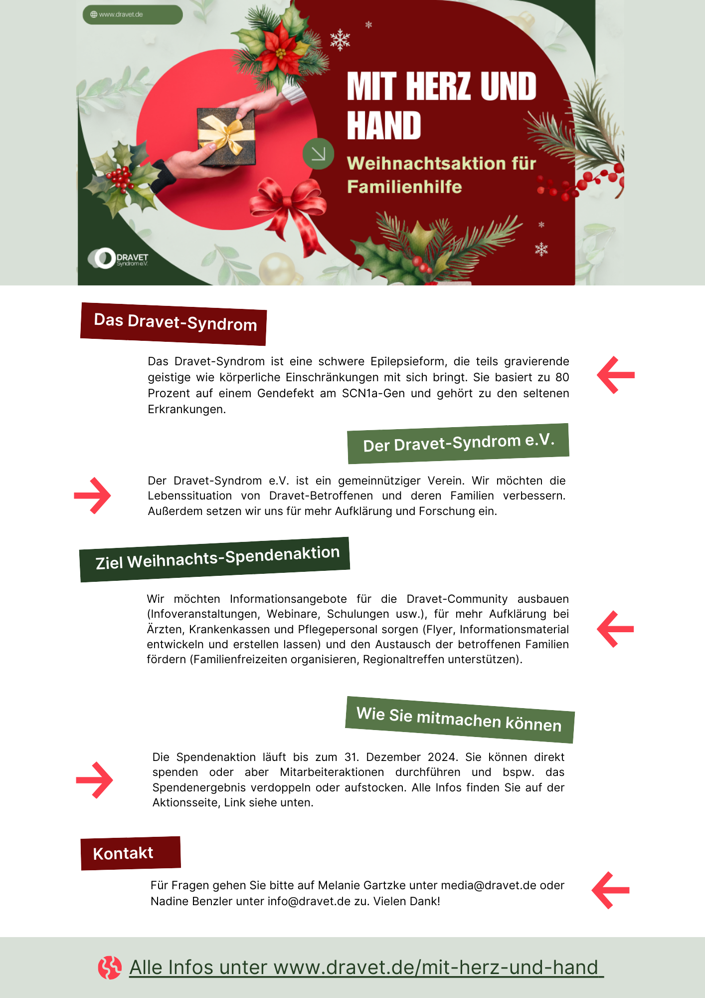 „Mit Hand und Herz“ ist die ers­te Weih­nachts­spen­den­ak­ti­on des Dra­vet-Syn­drom e.V. Infor­mie­ren Sie sich hier über die Zie­le der Spen­den­ak­ti­on, wel­che Pro­jek­te geför­dert wer­den und wie Sie uns als Pri­vat­per­son oder Unter­neh­men unter­stüt­zen kön­nen.